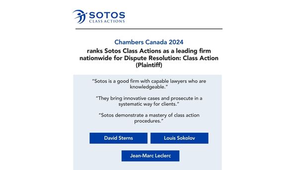 We are proud to announce that Chambers Canada 2024 has ranked Sotos Class Actions as a leading law firm in Canada for Dispute Resolution: Class Action (Plaintiff). Additionally, we are proud to highlight the recognition of three of our lawyers for their outstanding individual excellence: David Sterns, Louis Sokolov, and Jean-Marc Leclerc.