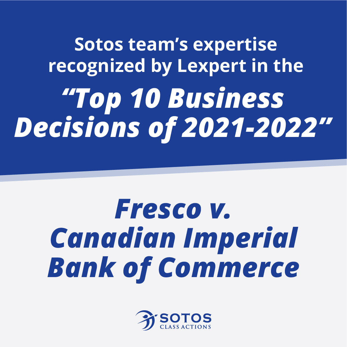 Lexpert has released its Special Edition: Litigation 2022 and recognized Sotos team members Louis Sokolov and Jean-Marc Leclerc for their litigation and dispute resolution expertise. The team is featured for its successful representation of the plaintiff in Fresco v. Canadian Imperial Bank of Commerce, 2022 ONCA 115.