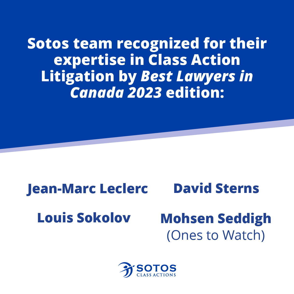 Sotos Class Actions team has been included in the 2023 edition of The Best Lawyers in Canada for their work in Class Action Litigation. Congratulations to Jean-Marc Leclerc, Louis Sokolov, David Sterns, and Mohsen Seddigh (Ones to Watch). We want to express our gratitude to our clients and peers for their continued support and trust.