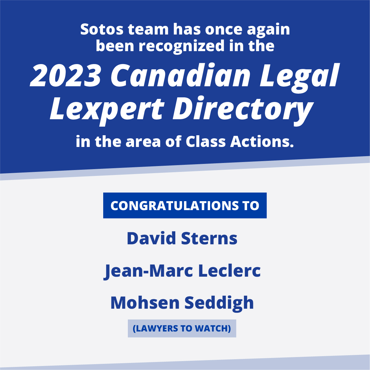 We are thrilled to announce that Sotos has been recognized as the "Consistently Recommended" firm under Toronto Leading Firms – Boutique Firms for Class Actions in the recently released 2023 Canadian Legal LEXPERT Directory. This prestigious directory, which has been published since 1997, identifies the top lawyers and law firms across Canada based on an extensive peer survey process.